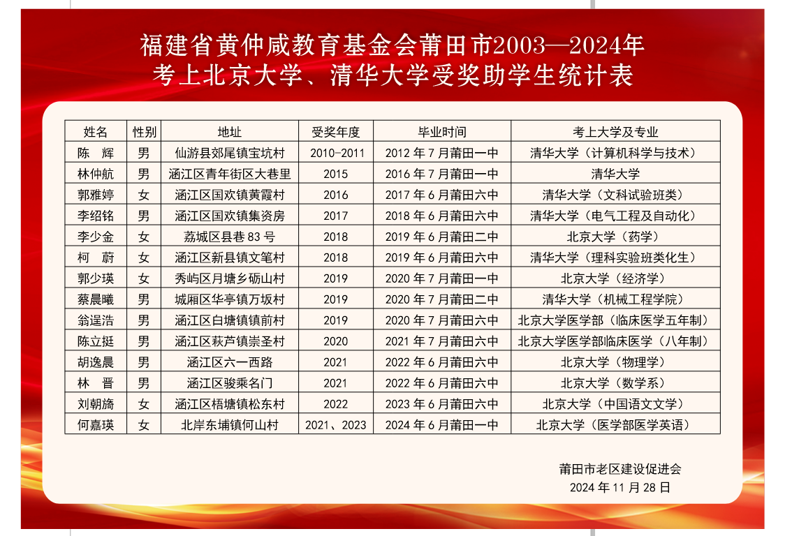 莆田市历年来受该基金奖助学生考上北京大学、清华大学情况。