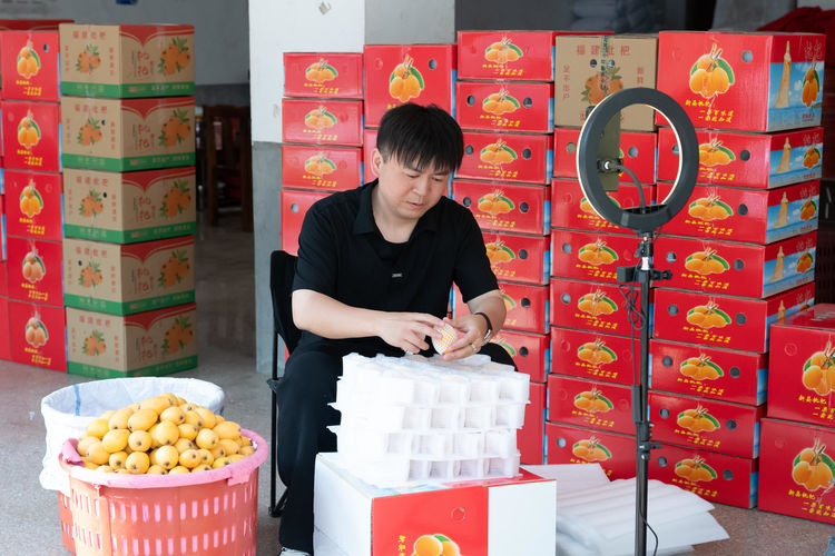 涵江区新县老区镇近年来大力发展枇杷产业,目前种植面积约2.5万亩,年产枇杷1万多吨,是当地农户增收的主要产业。图为新县镇文笔老区村省级枇杷产业基地的果农在带货直播。
