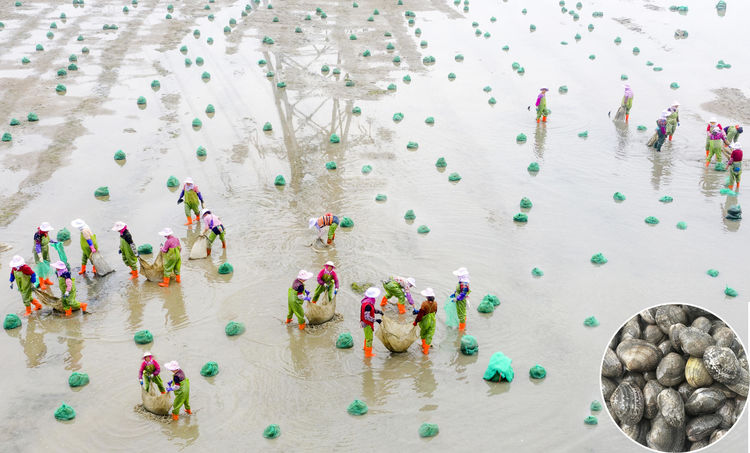 莆田市享有“中国花蛤之乡”称号,“莆田花蛤”具有全国农产品地理标志登记证书和国家地理标志证明商标。图为城厢区灵川老区镇全国最大的花蛤养殖基地。