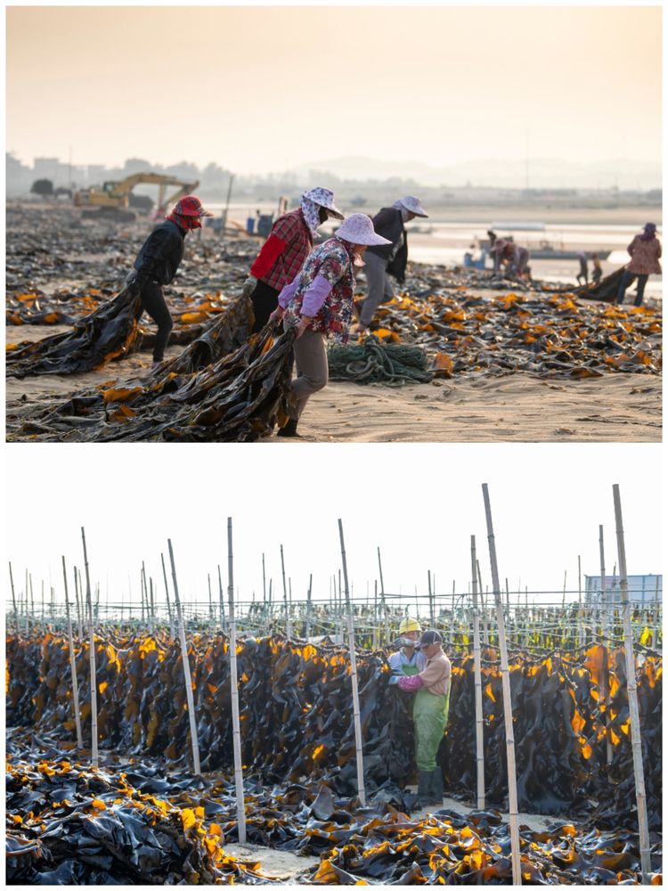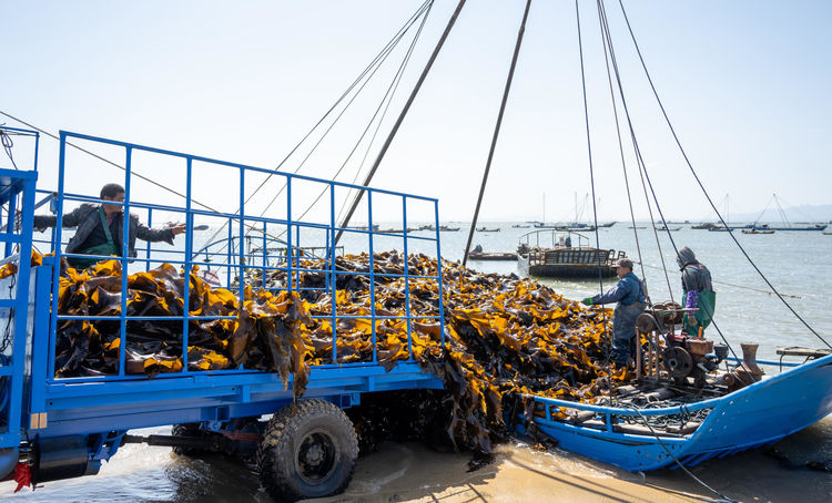 莆田海带年总产量已达21万吨,成为福建省的主产地;“南日海带”是国家地理标志证明商标。图为海带收成场面。