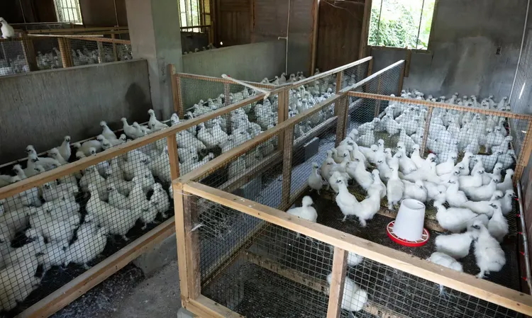 丝羽(白绒)乌骨鸡具有“雪白羽、丝绒毛、乌黑体、荔枝冠、青铜耳”等特征。图为荔城区新度老区镇国家级丝羽(白绒)乌骨鸡保护场。