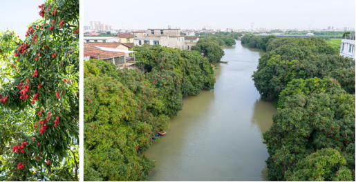 “陈紫”为莆田荔枝古老的优良品种,核小肉厚,香气浓郁,是莆田主栽品种。图为位于吴江老区村河道两岸的“陈紫”荔枝树。