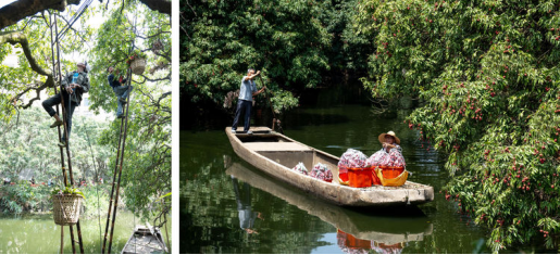 北大老区村盛产荔枝,村内百年以上古荔树达1500多棵。图为该村河边荔枝采摘装筐外运。