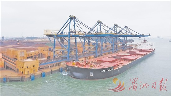 图为40万吨级铁矿石船“矿石天津轮”靠泊罗屿港口9号泊位。