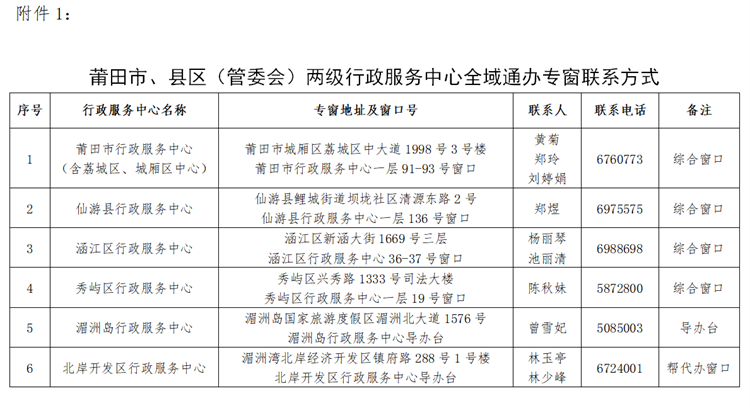 附件:1.莆田市、县区(管委会)两级行政服务中心全域通办专窗联系方式