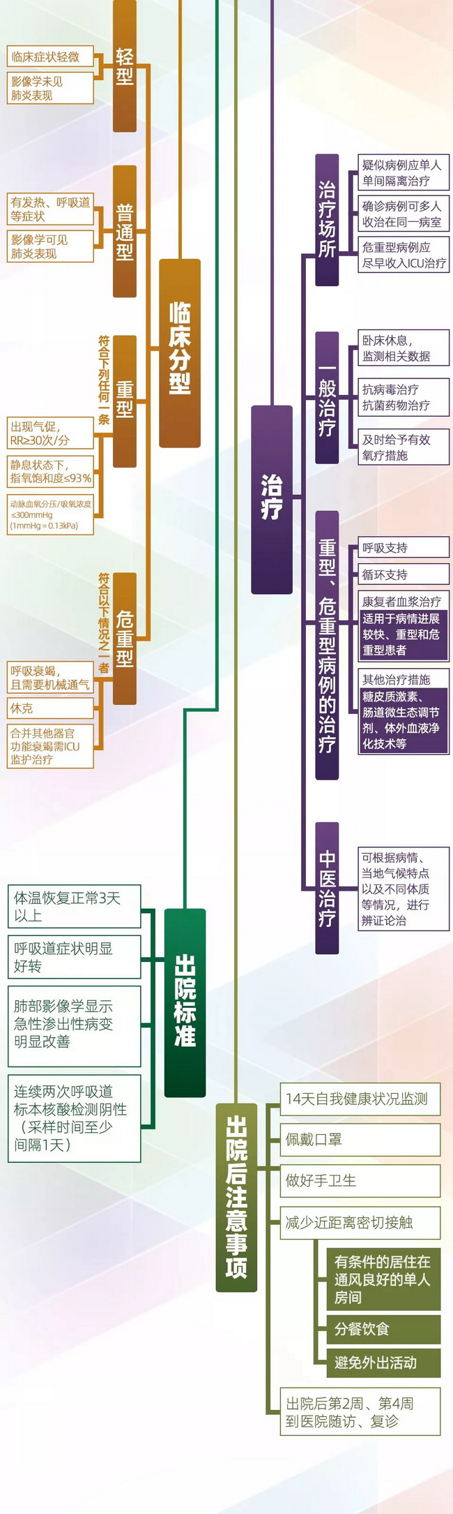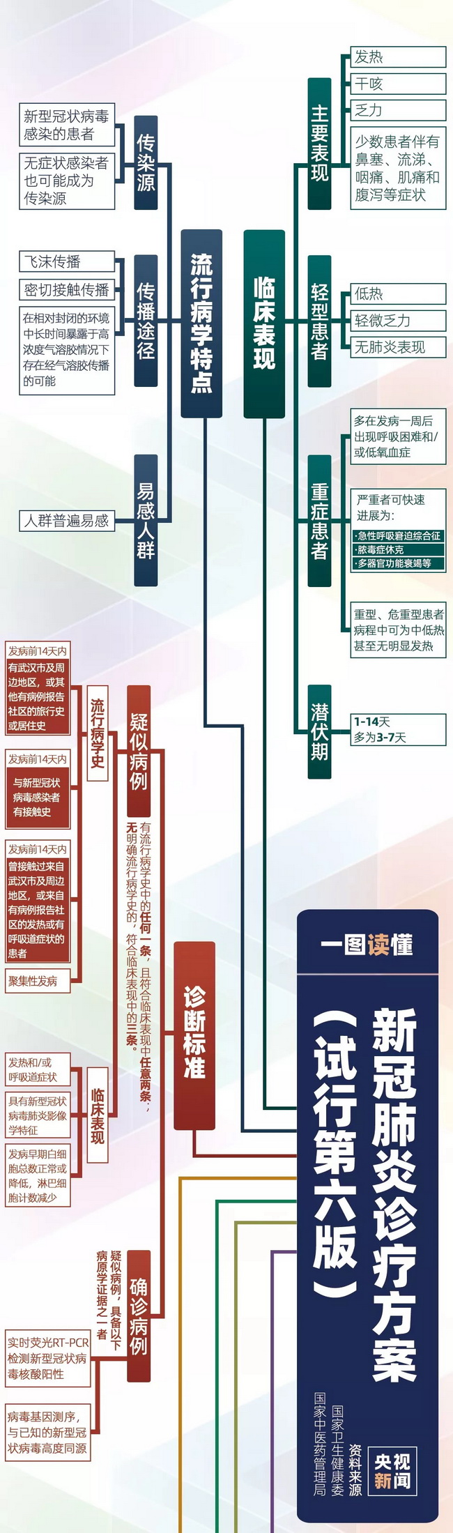 第六版诊疗方案中有关新冠肺炎传播途径、流行病学特征、诊断标准、治疗、出院后注意事项等要点,通过一张图了解一下↓↓↓