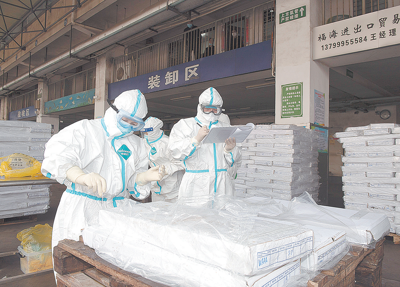 23日,在福州市马尾区名成冷链物流中心,工作人员对进口海鲜食品及外包装取样,以进行核酸检测。该中心建有15万吨冷库,有涉及进口冷链食品经营批发和储存业务的商户40户,产品辐射全国各地。(记者 张永定 摄)