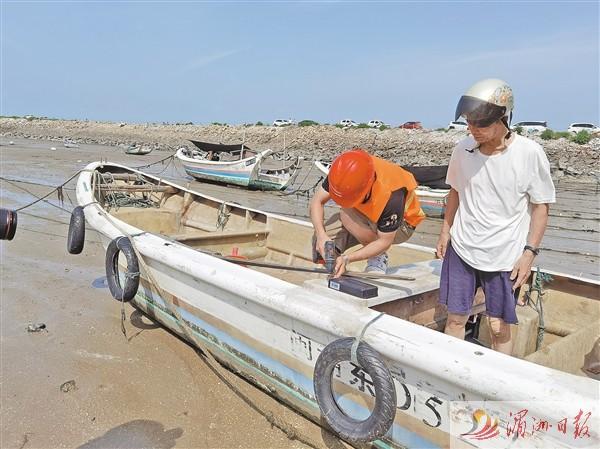 海岸线一望无际,船舶星星点点,北岸“五联防”海安巡逻队员在场一一核对登记在册的船舶,引导技术人员安装定位仪。阳光炙热,安装场面火热。自家船舶首次安装定位仪,渔民吴金锁在旁好奇地向技术人员咨询定位功能和使用方法(如图)。他高兴地说,定位仪还有报警功能,遇到紧急情况,能按钮报警,以后出海,更安全,也更安心了。