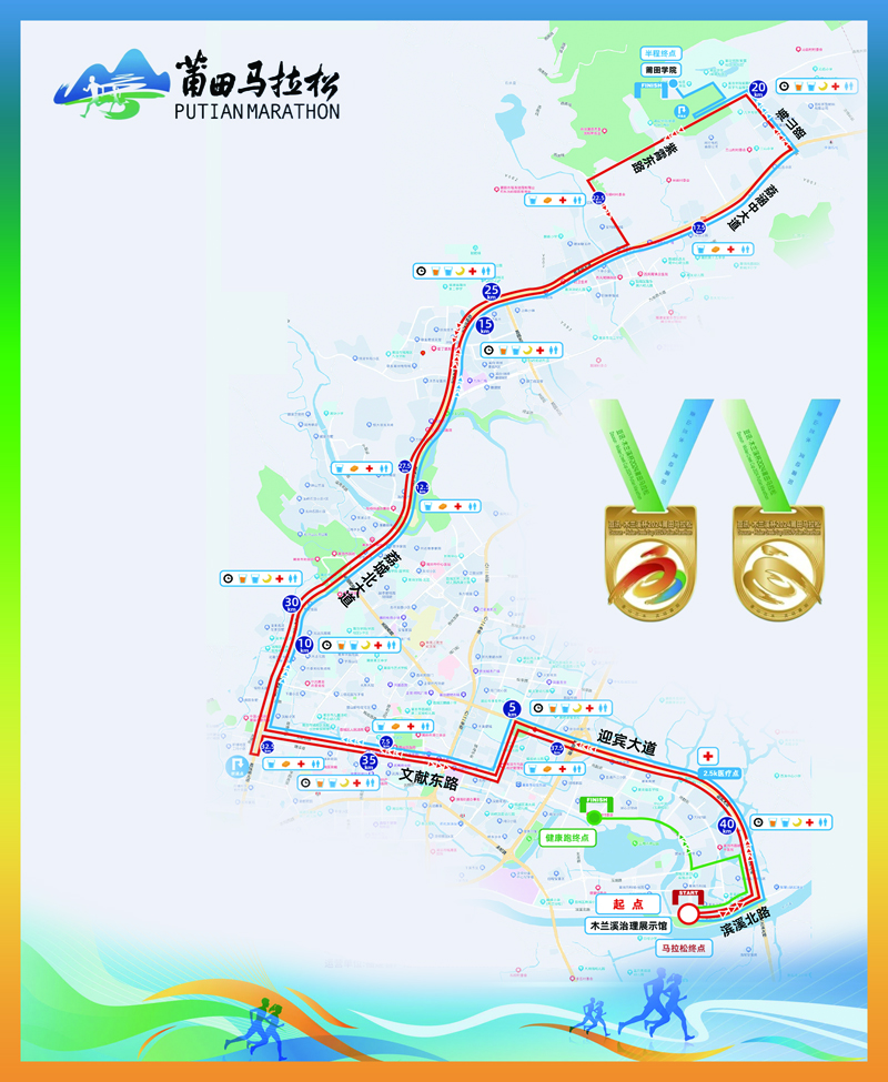 据介绍,本次赛事的全程马拉松、半程马拉松、健康跑起点均在莆田市木兰溪治理展示馆。赛道路线将串联起木兰溪、莆仙戏剧院、古谯楼、文峰宫、莆田市博物馆、绶溪公园等莆田城市地标和风景名胜。不仅适合选手们创造优秀成绩,也可观赏壶山兰水的美妙景致。其中,半程马拉松终点在莆田学院新校区大门口。