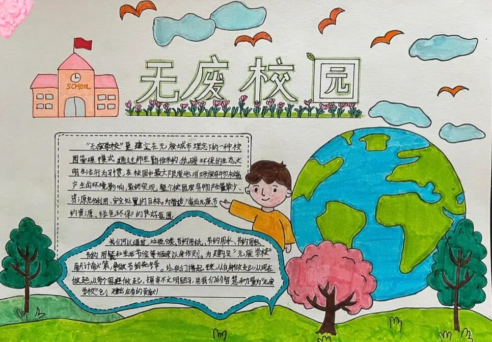 学校组织学生开展“变废为宝”主题活动、垃圾分类手抄报比赛、主题班会等活动,使学生了解创建“无废学校”、垃圾分类的意义,以“崇尚无废、节约资源、绿色环保”为己任,改变旧习惯,树立“无废”新风尚;积极倡导崇尚节约、厉行“无废”的理念,培养主人翁意识,自觉投入到“无废学校”建设的宣传和实践中去。