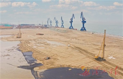 4月7日,记者在莆头港口3号、4号泊位施工现场看到,水工主体部分向海延伸,与码头围堰圈起的陆域形成部分已现雏形。距码头不远处的海面上,一艘绞吸船将海砂吹填进围堰。部分陆域形成区域已完成砂垫层、堆载等软基处理施工;数组工人使用大型机械设备同步进行塑料排水板施工,加快陆域固结、排水,进一步提高效率、缩短工期。