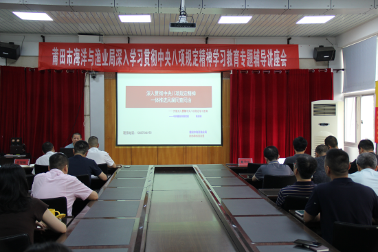 为深入学习领会习近平总书记关于加强党的作风建设的重要论述,5月22日上午,莆田市海洋与渔业局召开深入贯彻中央八项规定精神学习教育专题辅导讲座。邀请市委党校、市行政学院张洪林副教授作“深入贯彻中央八项规定精神 一体推进风腐同查同治”专题辅导讲座,讲座由局党组成员、副局长韩云飞主持,局机关、执法支队、水技站、环境监测站、水科所全体党员干部职工参加。