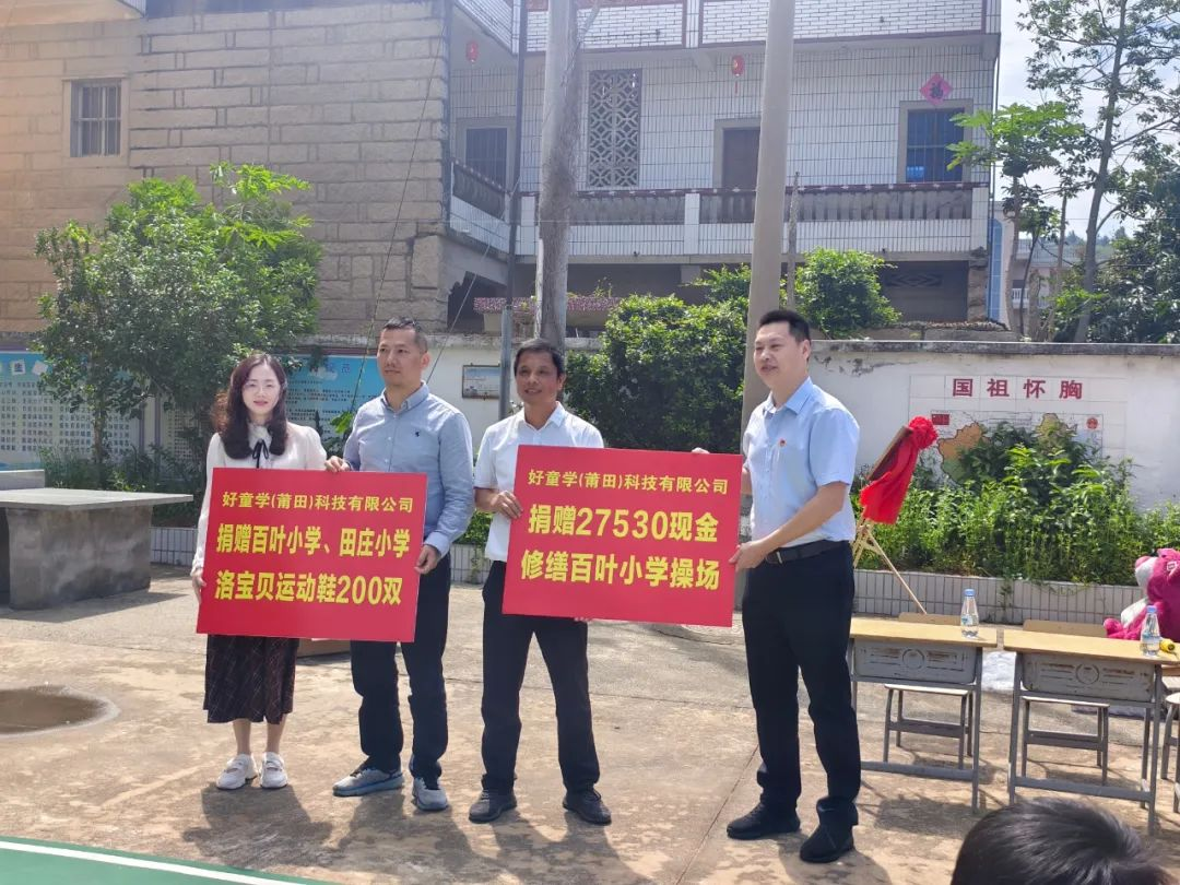 活动中,好童学公司捐资修建的操场正式揭牌启用,投入金额27530元。该操场的竣工为学校落实“五育并举”、促进学生全面发展提供了有力保障。好童学公司还向百叶小学和田庄小学的孩子们捐赠了200双莆田鞋授权品牌--“洛宝贝”童鞋。