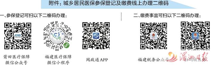 4.城乡居民可持户口簿、社会保障卡(无社会保障卡的持身份证、本市居住证或外国人居留许可材料)、新生儿由家长携带户口簿到莆田市各医保经办服务窗口办理参保登记或者出生后通过“出生一件事”在医院办理。