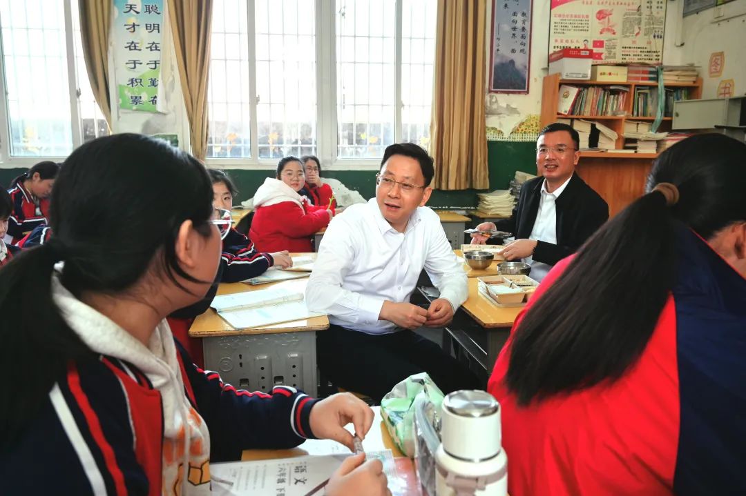 下课后,学生们有序就餐。付朝阳走进教室,与学生同坐一张桌,吃着一样的饭菜。“平时几点吃饭?饭菜的口味怎么样?最喜欢吃哪个菜?”付朝阳和学生亲切互动,谈学习、话家常、聊理想,从质朴的话语中了解学生对学校饭菜、校园环境等方面的评价和建议,并殷切鼓励孩子们注重营养均衡,加强身体锻炼,不断茁壮成长。