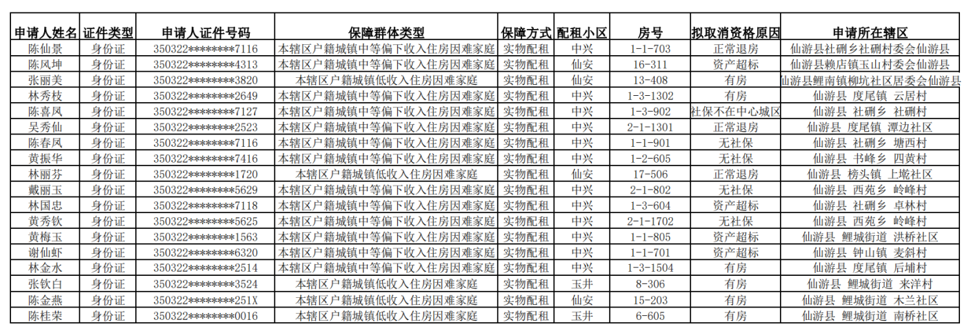 现将仙游县公租房保障家庭仙游县陈仙景等18户拟退出保障公示如下: