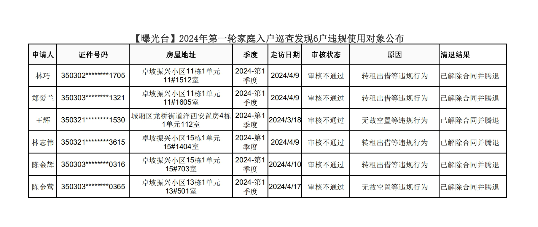 2024年第一轮家庭入户巡查发现6户违规使用对象公布,6户违规。