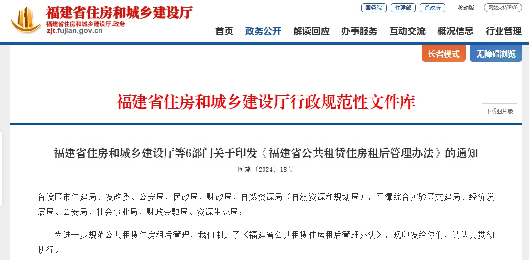 1、部门规范性文件:福建省住房和城乡建设厅等6部门关于印发《福建省公共租赁住房租后管理办法》的通知(闽建〔2024〕18号):
