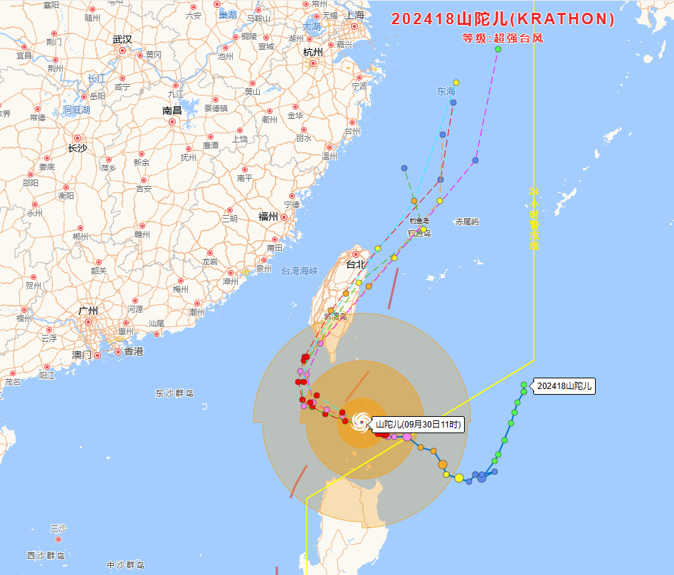 今年第18号台风“山陀儿”9月30日14 时中心距离台湾省鹅銮鼻南偏东方向约175公里,中心附近最大风力16级(55米/秒,超强台风级)。预计台风“山陀儿”将以每小时5~10公里左右的速度向偏西方向缓慢移动,强度还将有所增强,10月2日下午至夜里在台湾岛西南部沿海登陆。