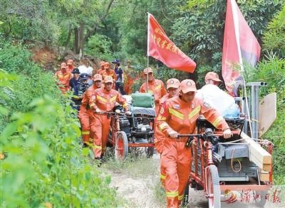 ▲市消防救援支队消防员肩扛器材装备徒步挺进“震中”。