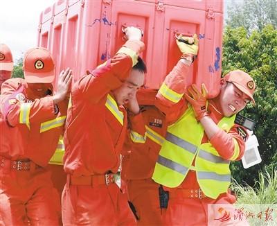 此次演练模拟晋江突发7.0级地震,灾区道路交通均被毁坏。莆田市消防救援支队第一时间启动跨区域地震救援应急预案,赶到晋江。该支队轻型地震救援专业队在完成装备点验后,迅速将装备和个人保障物资转移至器材推车,全速向“震中”挺进。徒步10余公里,复杂的路况,考验着全体参演消防员的毅力和耐力。经过5个多小时的艰难挺进,队伍终于到达“震中”既定作业区域,随即开设宿营地、建立通讯网、勘察灾区情况等。