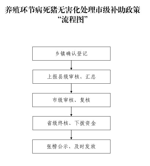 四、申报程序:乡镇政府将确认的上个月养殖环节病死猪无害化处理登记表报县级畜牧兽医主管部门,县级畜牧兽医主管部门会同同级财政部门汇总、审核、登记造册,附连同死亡率超过正常范围的养殖场的书面说明,逐级上报农业农村和财政部门。省、市两级分别对市、县汇总上报的数据进行审核把关,对发现存在数据不合理的地区进行复查,确认无误的纳入补助范围。