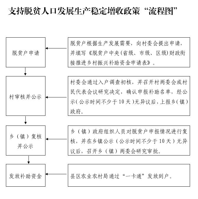 按照“脱贫户申请、村审核并公示、乡(镇)复核并公示、发放补助资金”的流程进行。