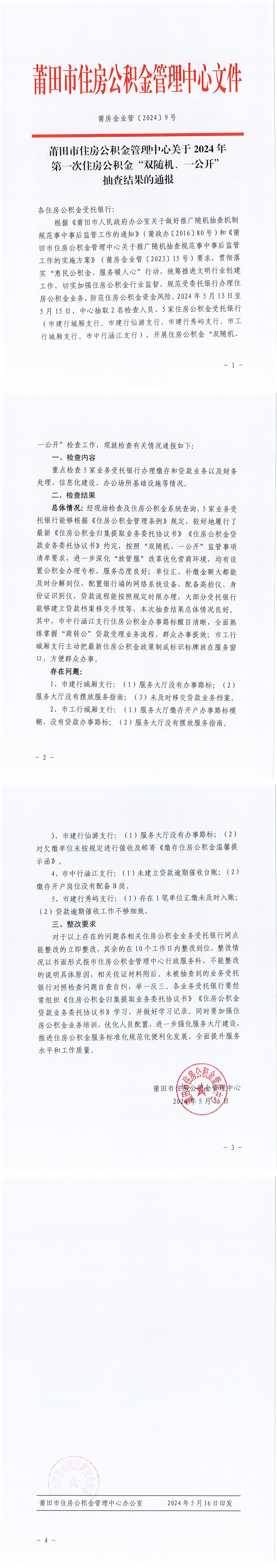 莆田市住房公积金管理中心关于2024年第一次住房公积金“双随机、一公开”抽查结果的通报